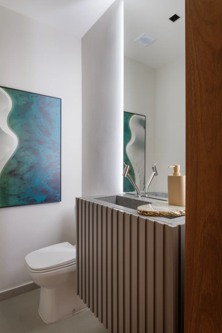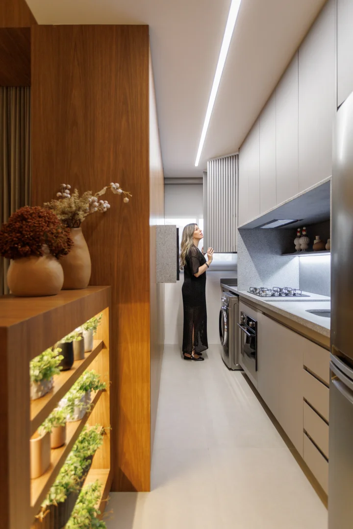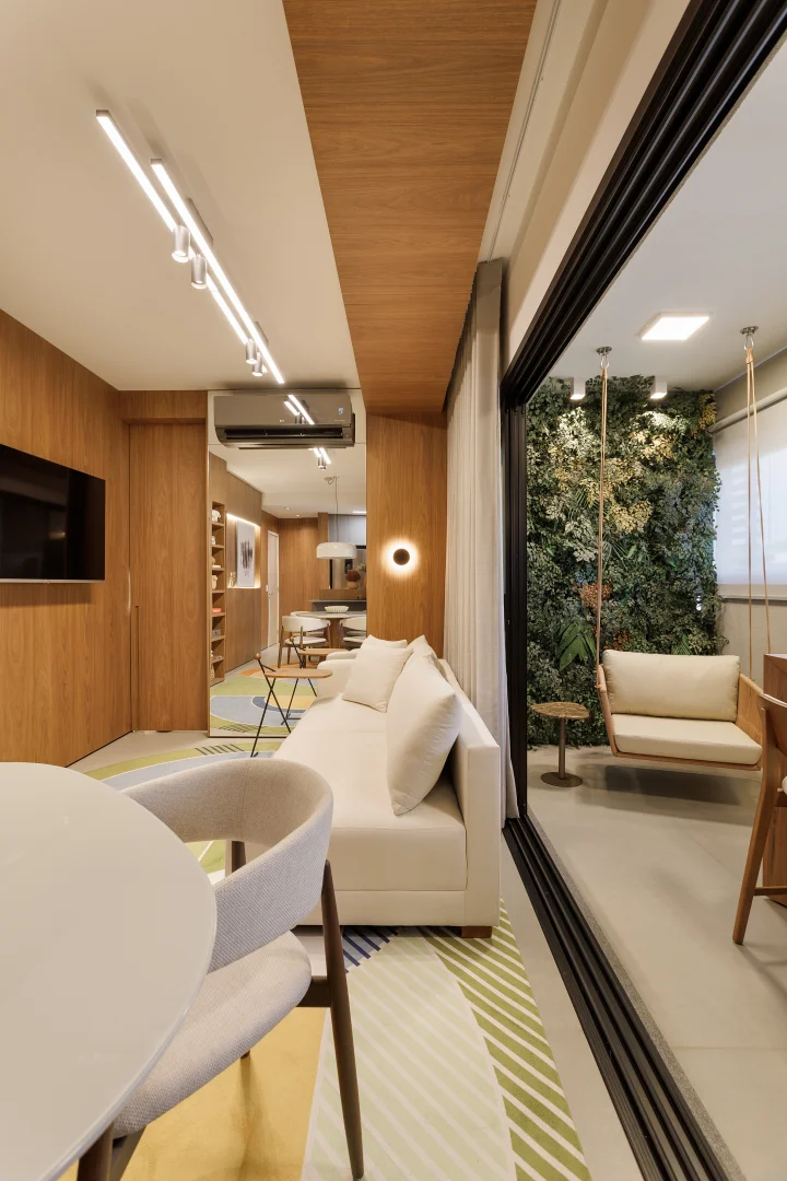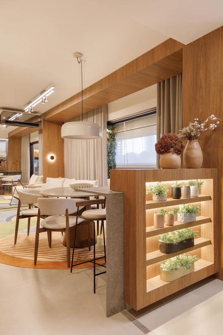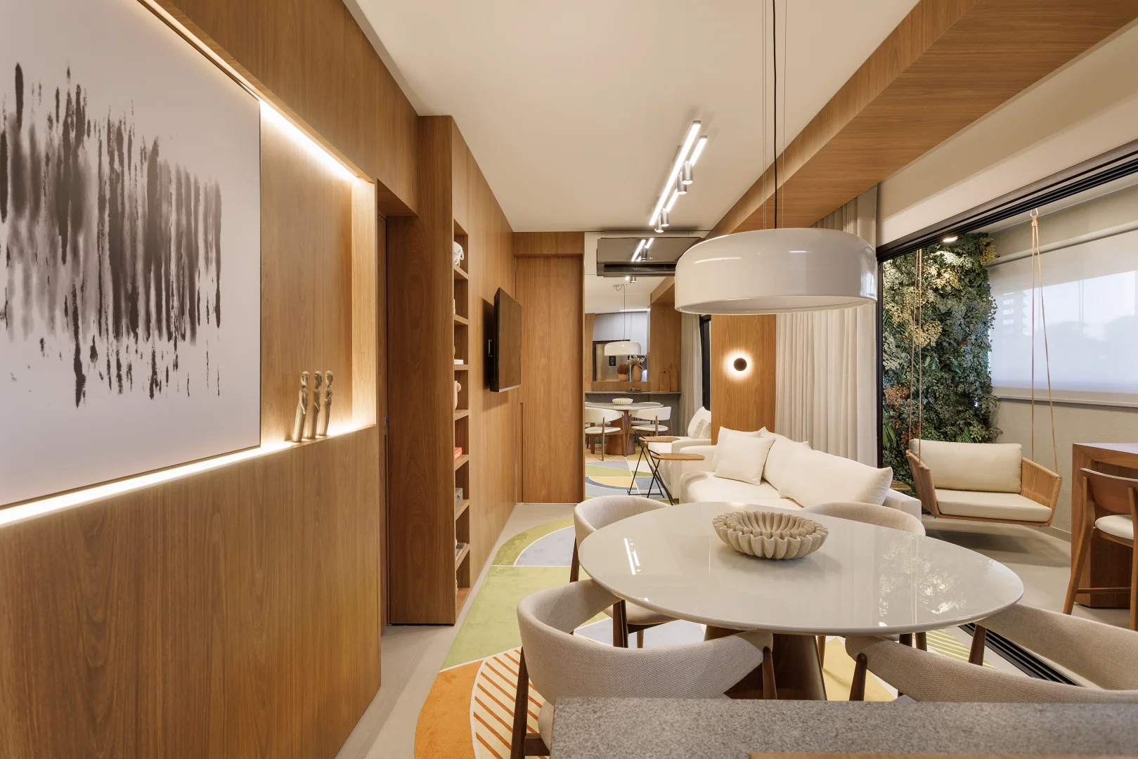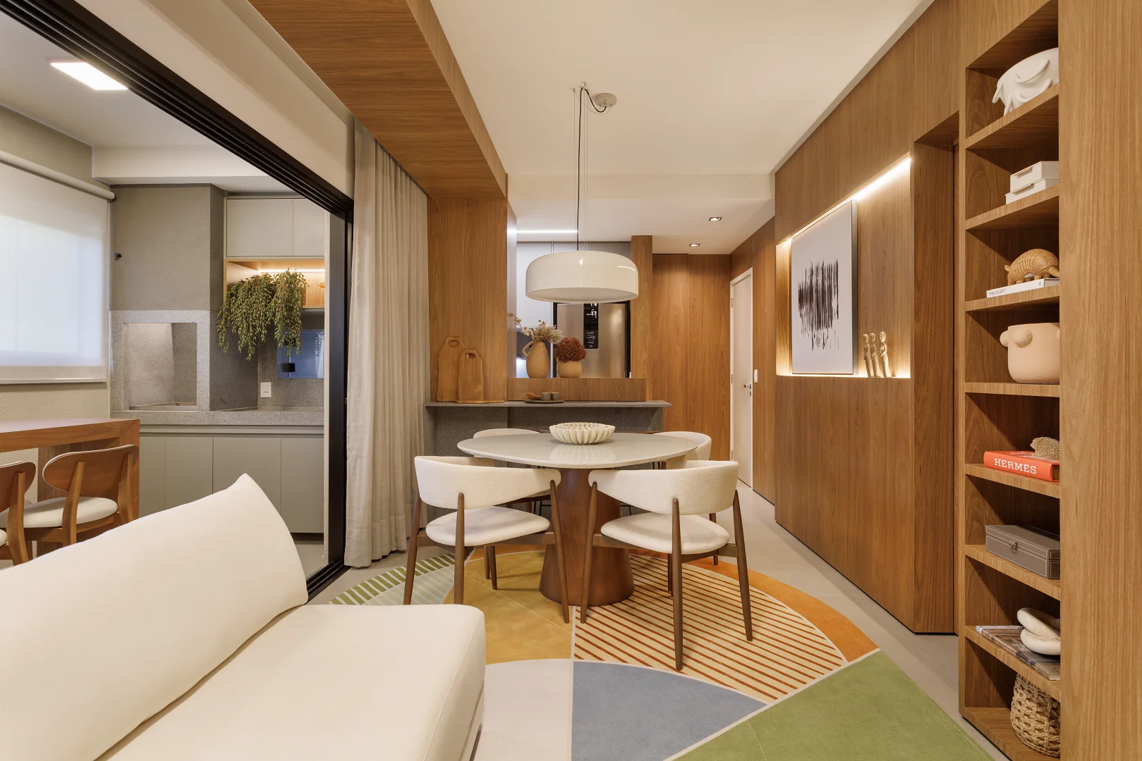 Desenvolvido sob encomenda da construtora Rocha Vaz, o Apartamento Decorado foi projetado com foco na apresentação comercial do empreendimento. A marcenaria em MDF foi estrategicamente utilizada para delimitar os ambientes, promovendo continuidade visual e integração espacial. Além do apelo estético, os painéis exercem funções funcionais, como a ocultação de elementos técnicos, a exemplo da porta do lavabo, posicionada no centro da sala e disfarçada de forma sutil mimetizada no painel.