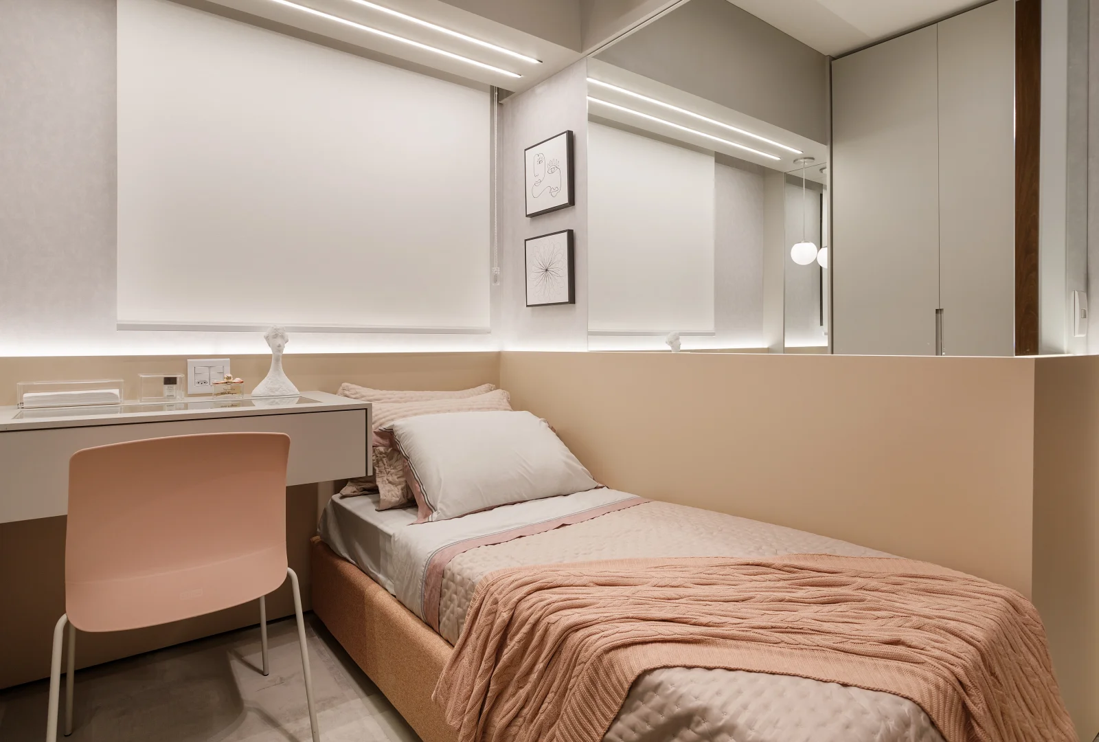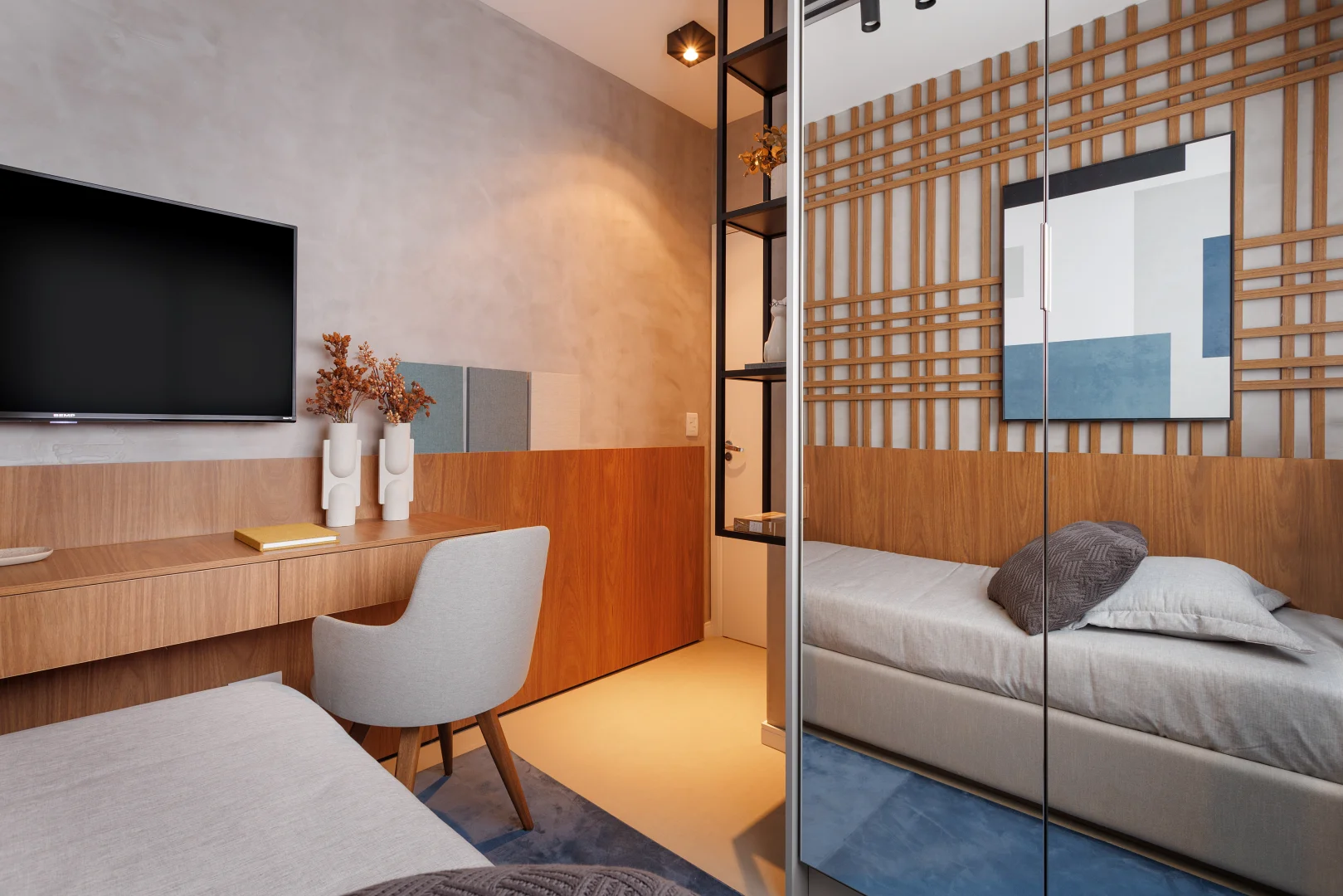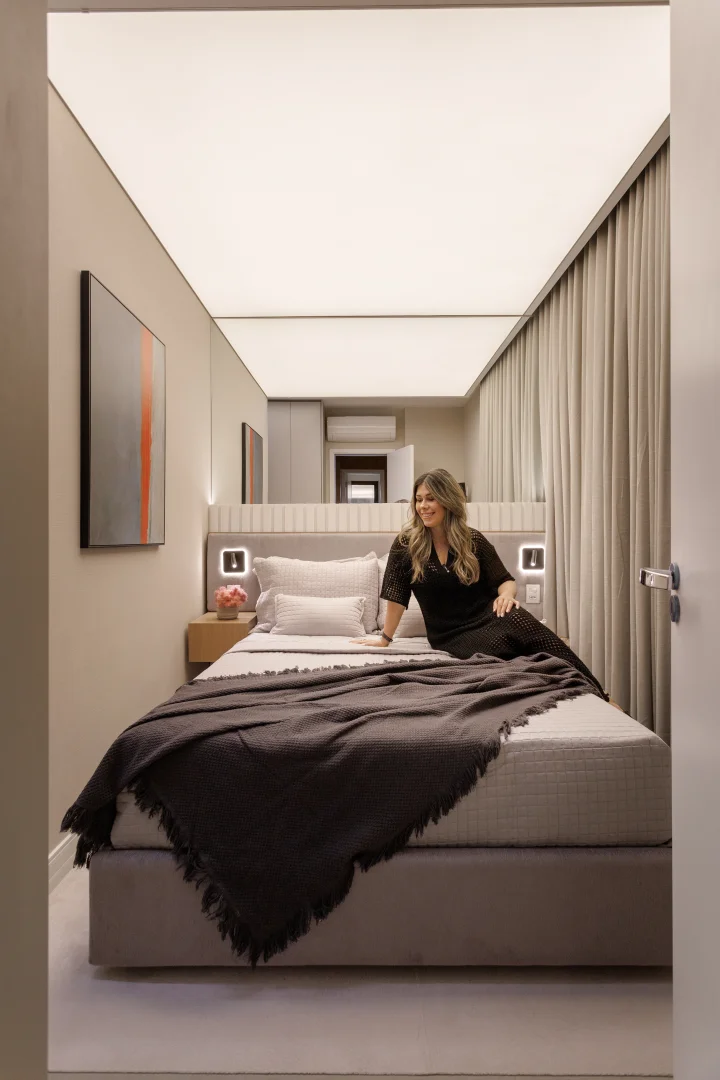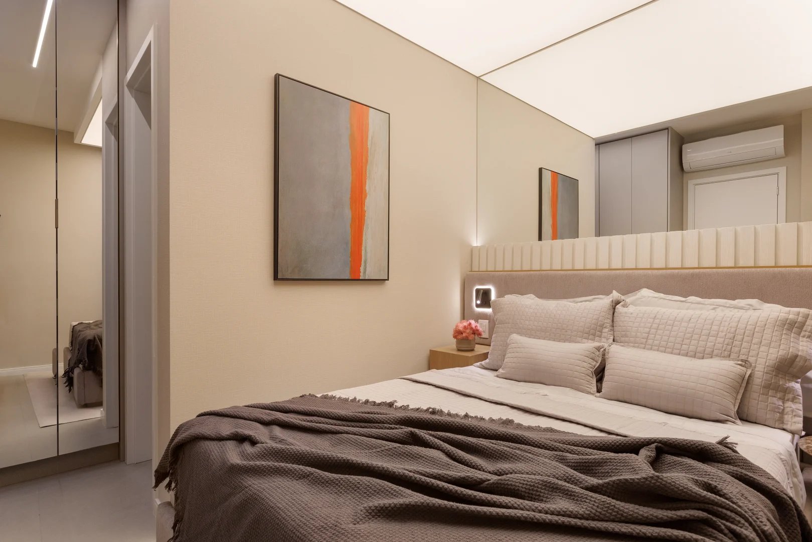 Nos dormitórios, a paleta de tons neutros e o amadeirado predominam, reforçando o conforto e a serenidade. A iluminação foi cuidadosamente pensada para gerar bem-estar, enquanto o uso de espelhos amplia os ambientes e traz leveza à composição.