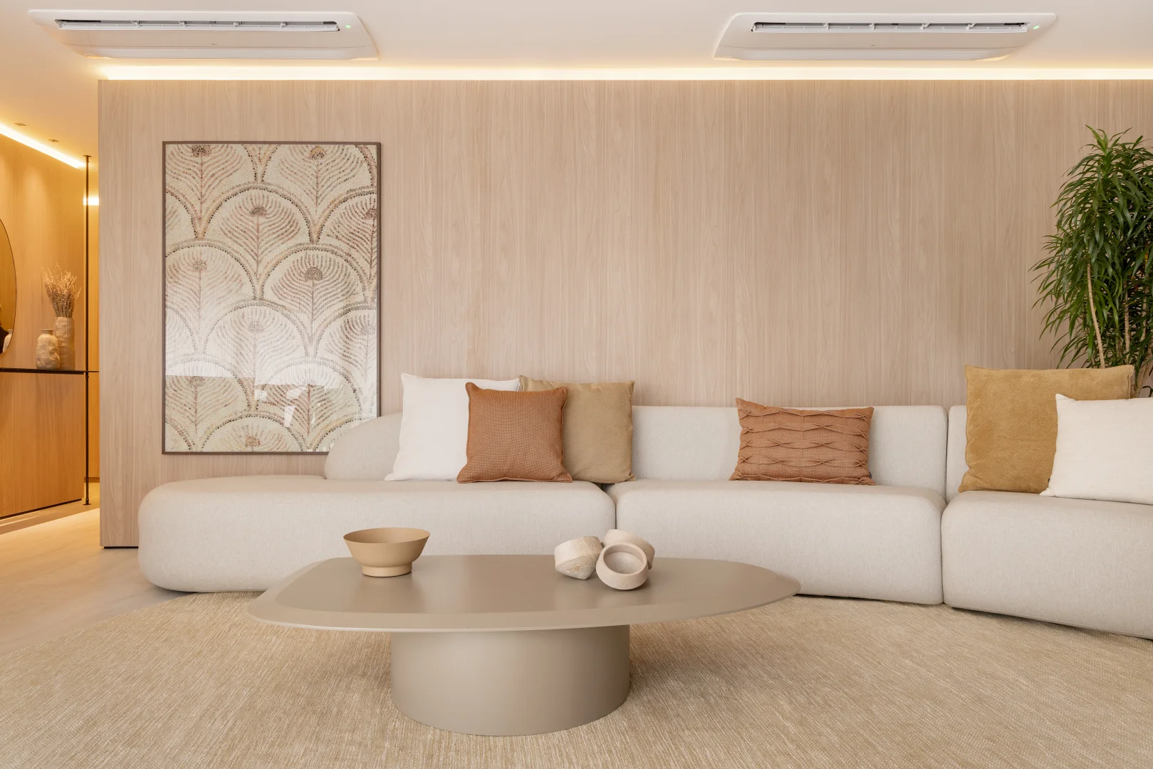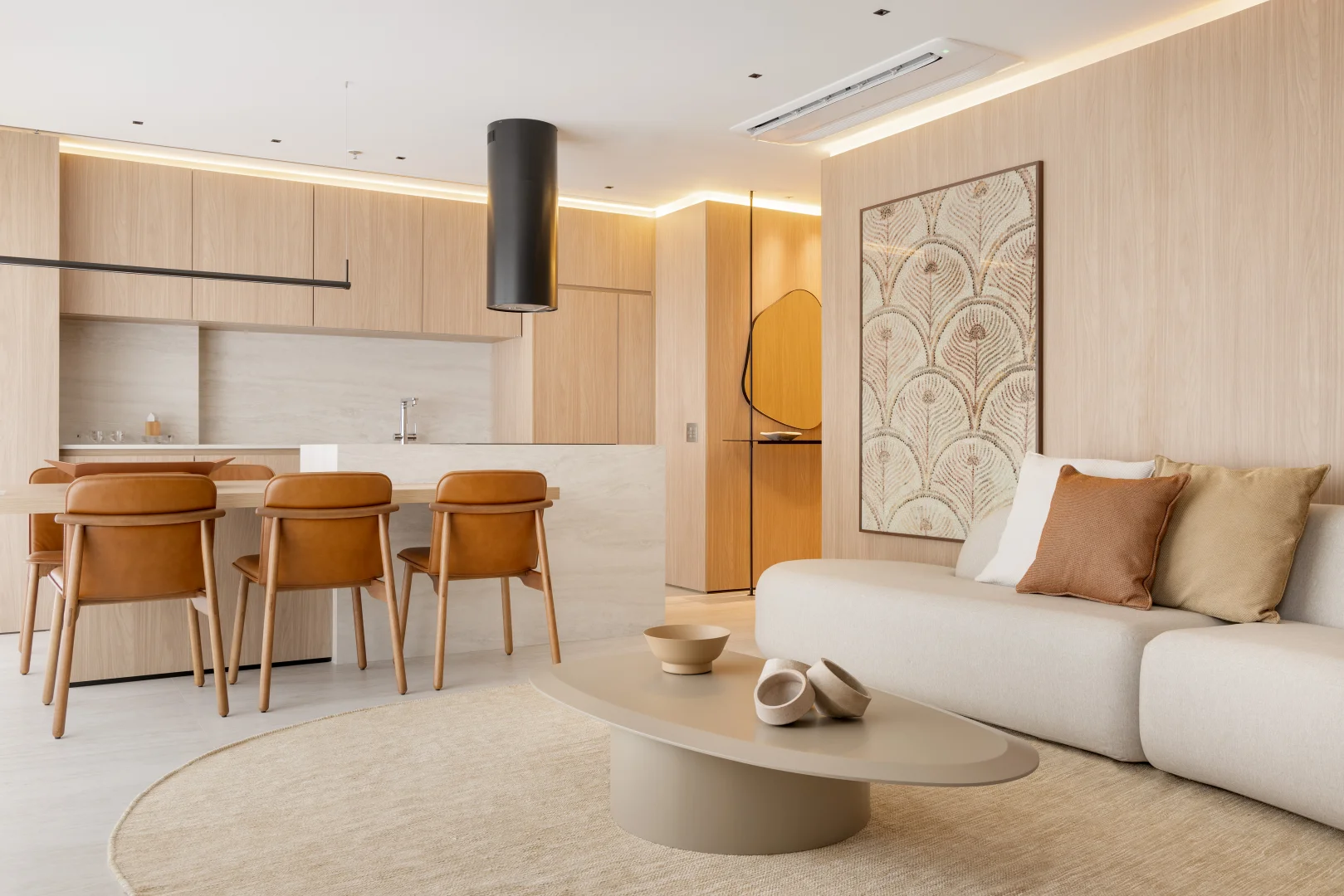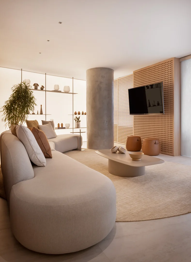 Parte essencial da identidade deste apartamento é o grande pilar de concreto na sala, que se integra de forma natural ao projeto, reforçando a proposta minimalista e a paleta neutra escolhida. O painel amadeirado com portas mimetizadas conecta os ambientes.