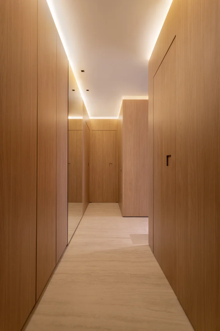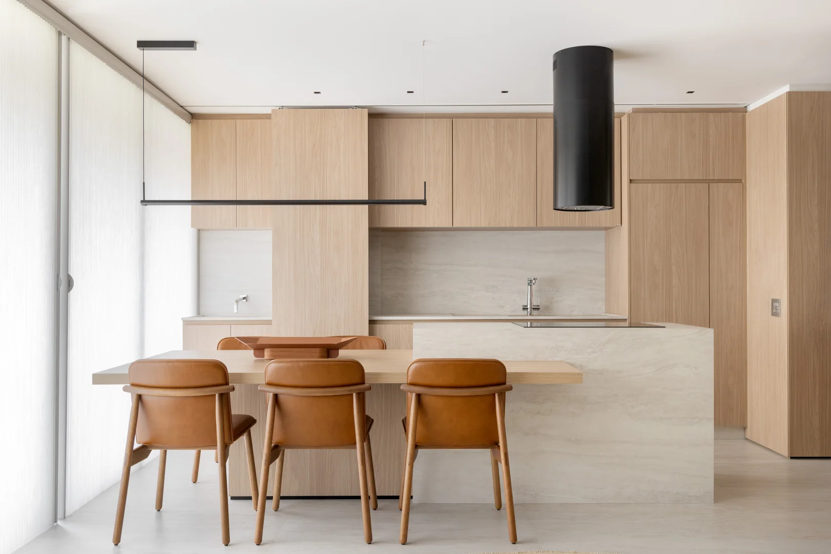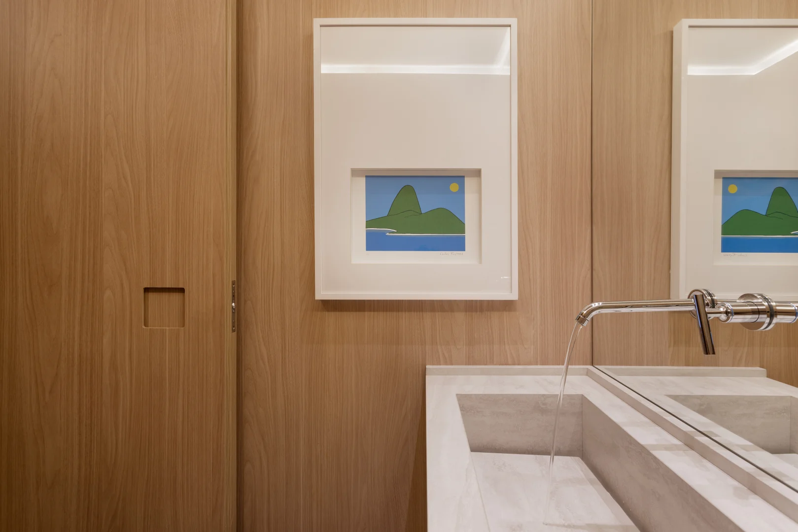 Parte essencial da identidade deste apartamento é o grande pilar de concreto na sala, que se integra de forma natural ao projeto, reforçando a proposta minimalista e a paleta neutra escolhida. O painel amadeirado com portas mimetizadas conecta os ambientes.