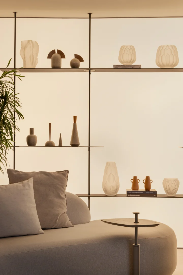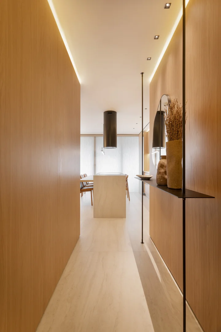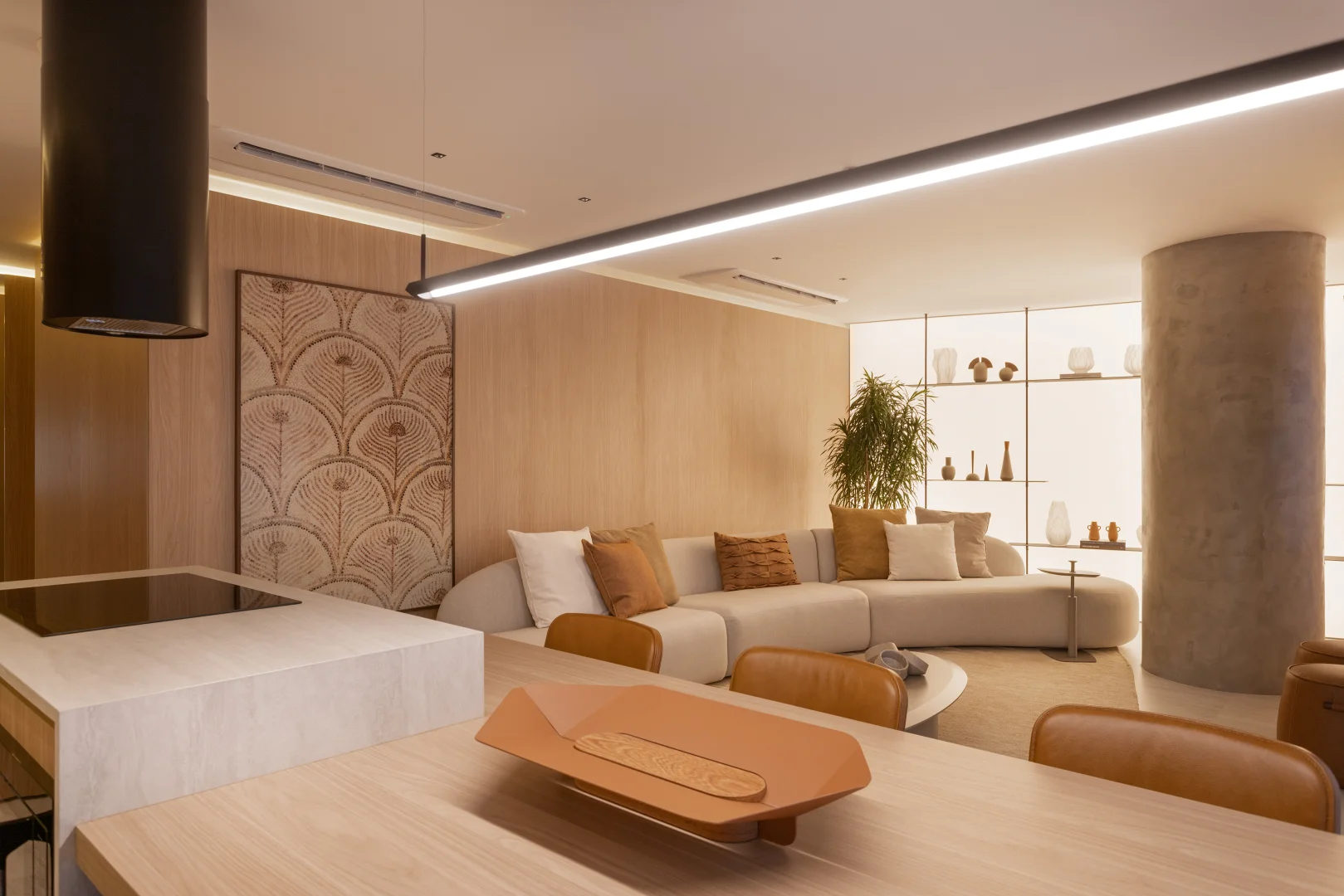 A iluminação difusa da tela tensionada e a leveza da estante metálica, com objetos cuidadosamente selecionados, trazem aconchego e elegância para a área social. O uso contínuo do mesmo revestimento no piso e nas bancadas amplia a sensação de integração entre sala e cozinha, resultando em uma composição limpa e sofisticada.