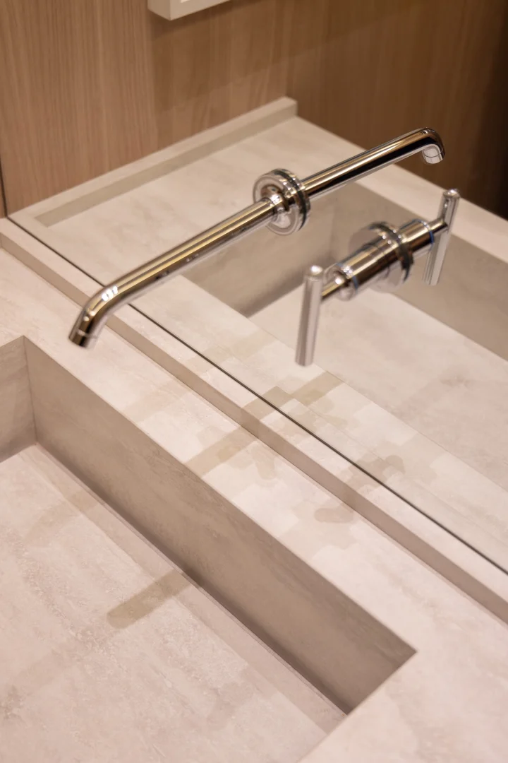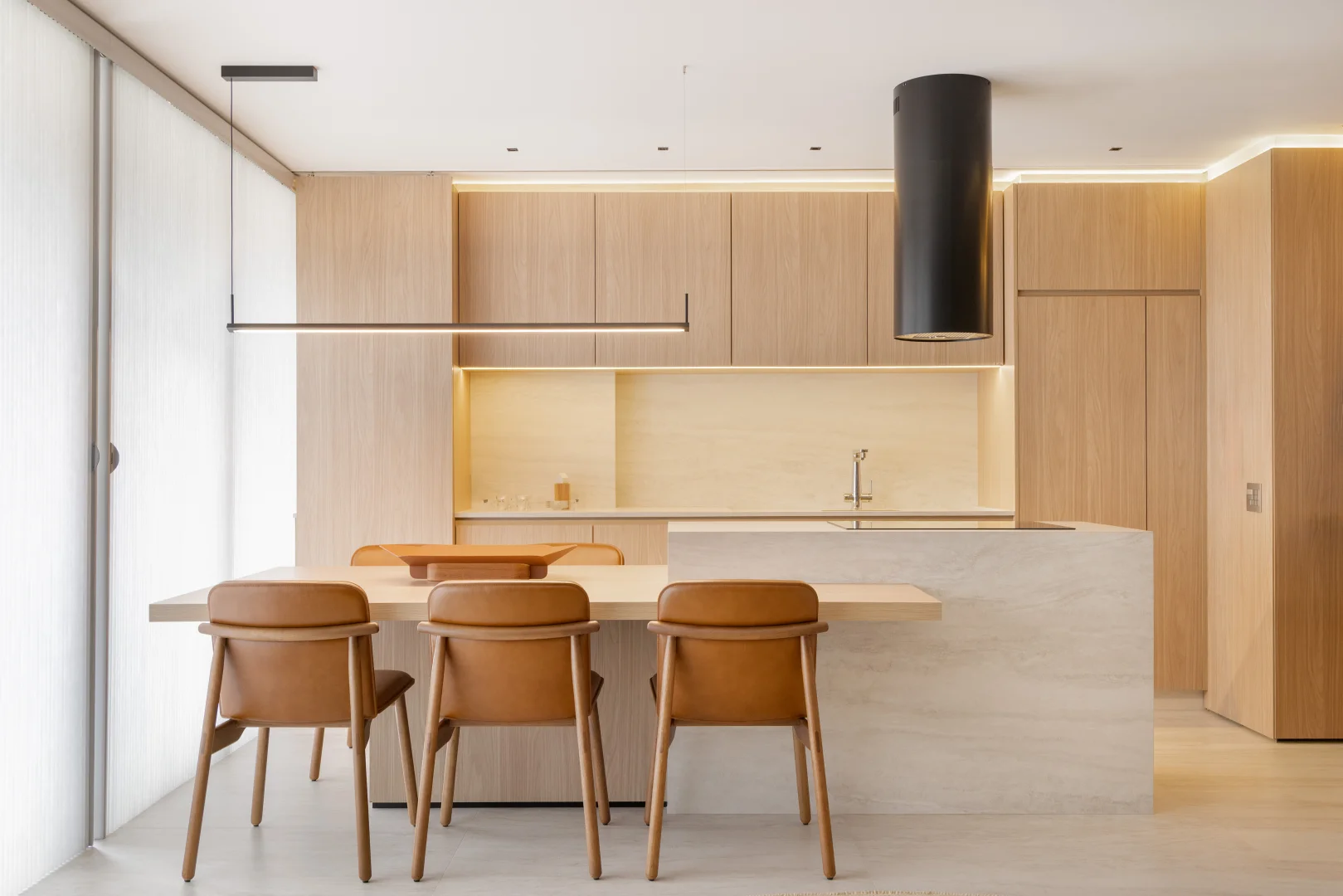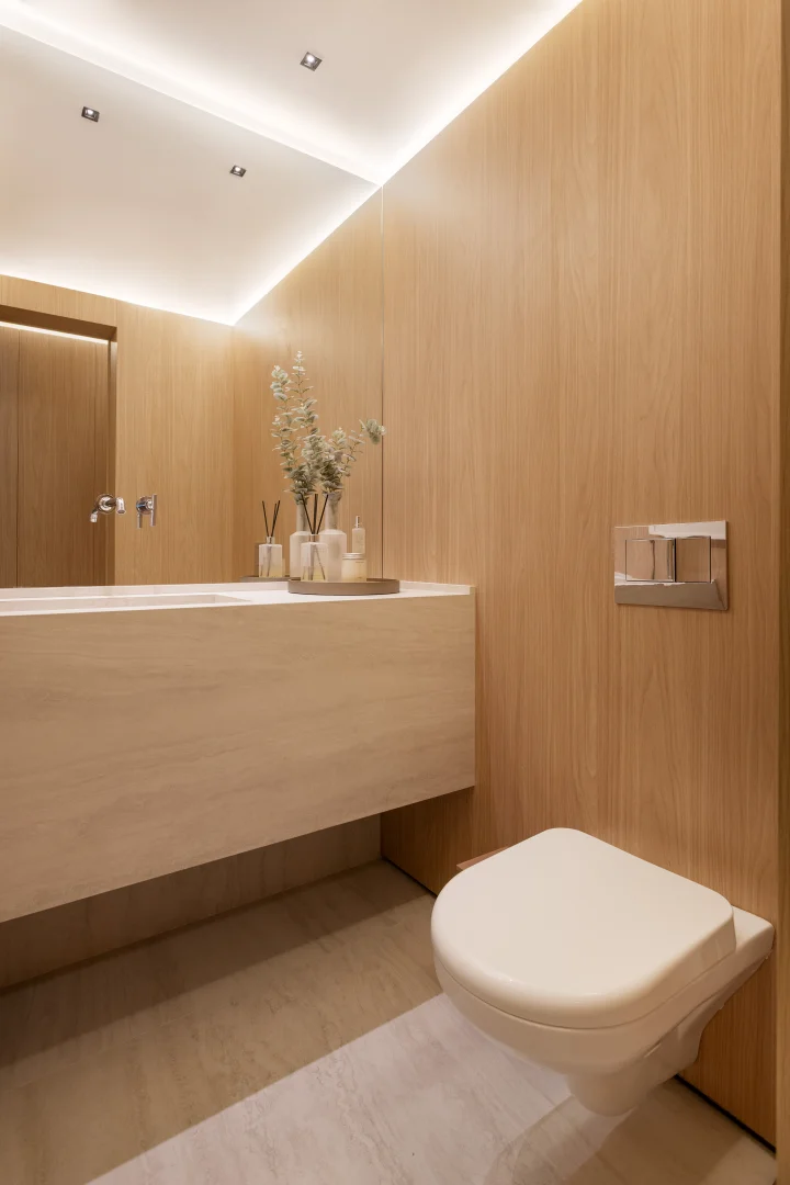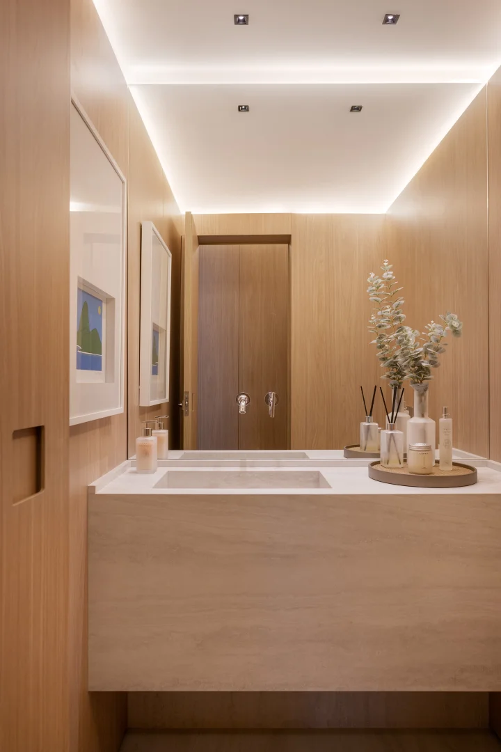 A iluminação difusa da tela tensionada e a leveza da estante metálica, com objetos cuidadosamente selecionados, trazem aconchego e elegância para a área social. O uso contínuo do mesmo revestimento no piso e nas bancadas amplia a sensação de integração entre sala e cozinha, resultando em uma composição limpa e sofisticada.