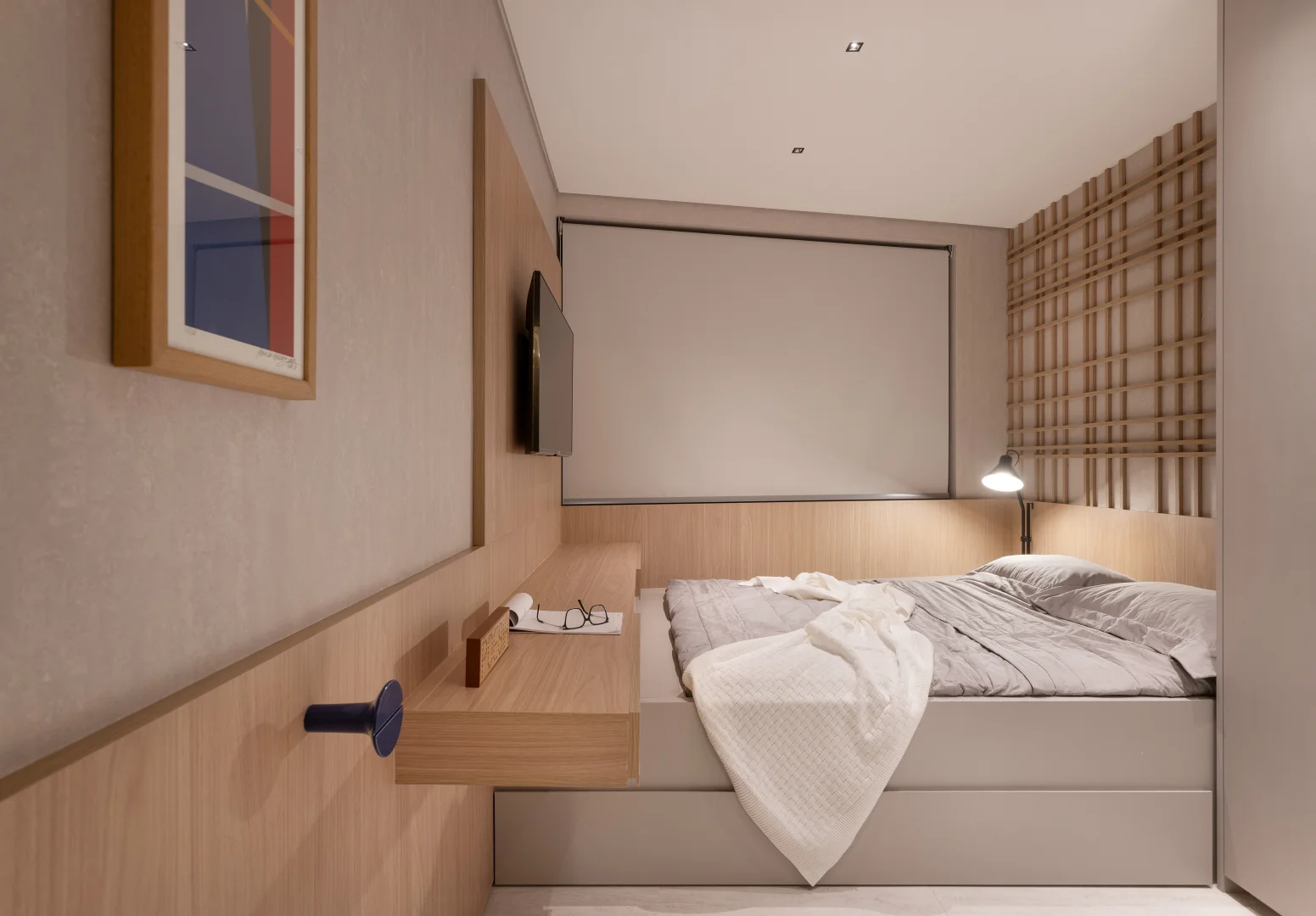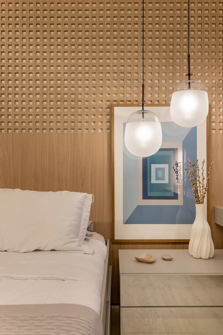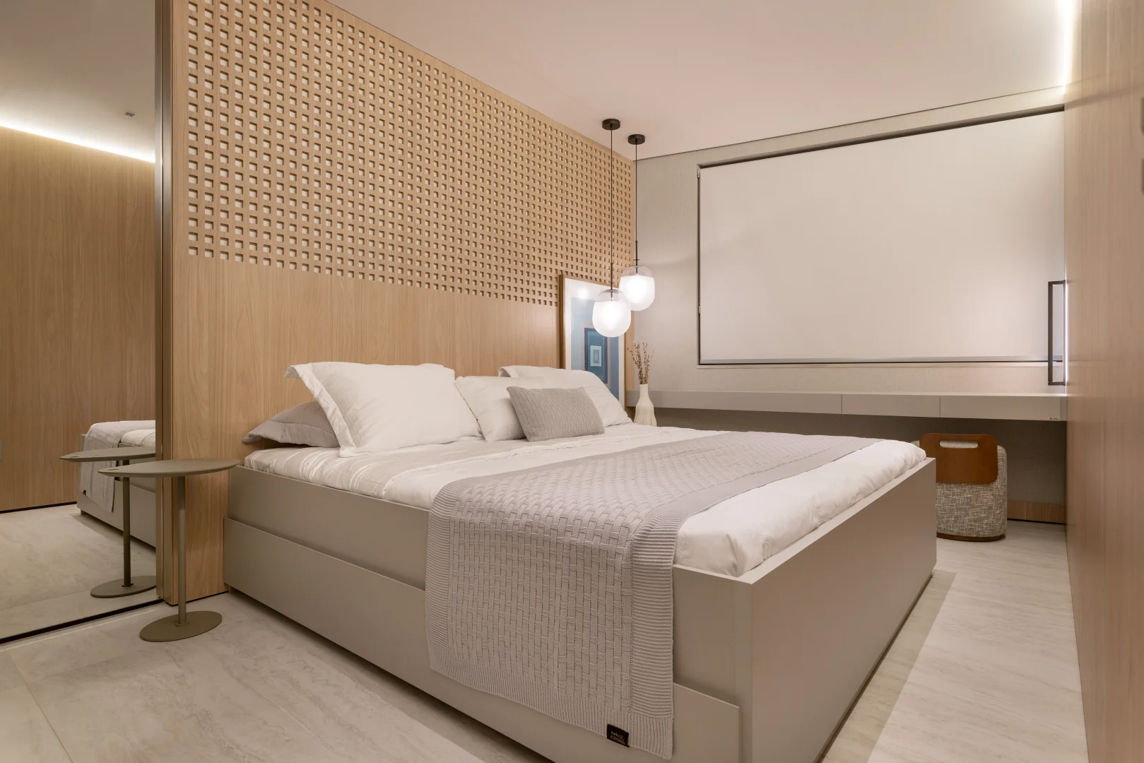 Nas suítes, o mobiliário foi pensado para unir conforto e funcionalidade: cada quarto recebeu uma cama de casal acompanhada de camas auxiliares, garantindo praticidade para acolher os hóspedes com charme e bem-estar.