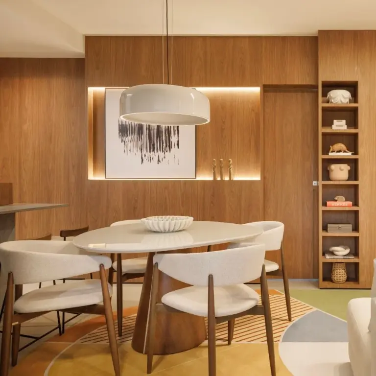 Áreas de lazer e social são integradas. De um lado os painéis de lâmina natural de madeira permitem o living ser aberto à sala de tv ou completamente fechado. Já entre living e gourmet, portas de vidro de correr garantem a ligação visual entre os ambientes.